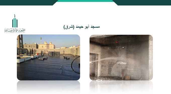 أعمال البناء في مسجد أبو حيمد (شرق) تشمل تنفيذ العزل المائي لسطح المسجد، ورش اللياسة الداخلية لجدران المسجد.