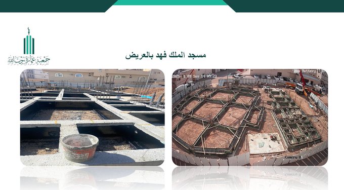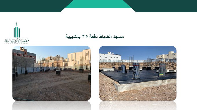 أعمال البناء في مسجد الضباط دفعة ٣٥ بالشبيبة، تم بحمد الله الانتهاء من أعمال العزل لقواعد مبنى المسجد ومبنى السكن، إضافة إلى أعمال الردم، وذلك ضمن مراحل التنفيذ الإنشائي للمشروع.