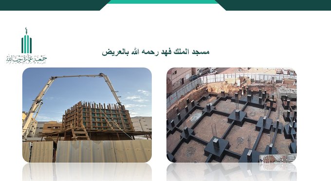 أعمال البناء بمسجد الملك فهد رحمه الله بالمدينة، تم الانتهاء من أعمال العزل لقواعد مبنى المسجد والسكن، إضافةً إلى صب المنارة، وذلك ضمن مراحل التنفيذ الإنشائي